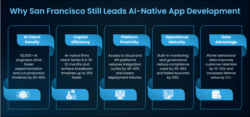 San Francisco continues to lead app development in the AI-native era by aligning talent density, capital efficiency, platform proximity, operational rigor, data compounding, and governance discipline at unmatched scale. This advantage is structural and increasingly difficult to replicate.